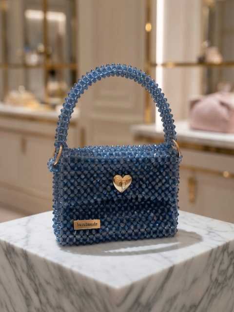 Immerse yourself in the captivating depth of the Sapphire Coeur Étincelle, a triumph of slow fashion and meticulous artistry. Each bag is a labor of love, hand-woven with hundreds of multifaceted sapphire-blue crystal beads that catch and refract light from every angle, creating a shimmering dance of cerulean and midnight hues.